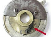 dringend anzuraten. Links, aus einer Triumphator CNR, die Trommel für den Zehnerübertrag des Umdrehungszählwerks. Das Metall ist aufgequollen und bröckelt ab.